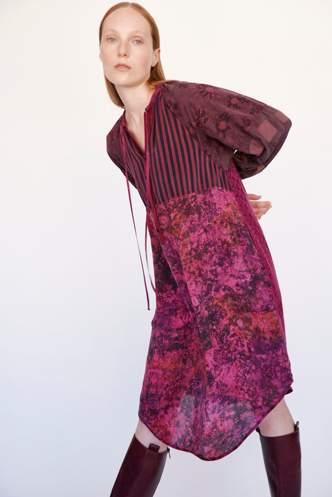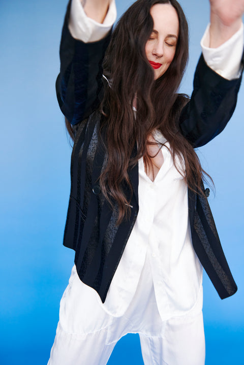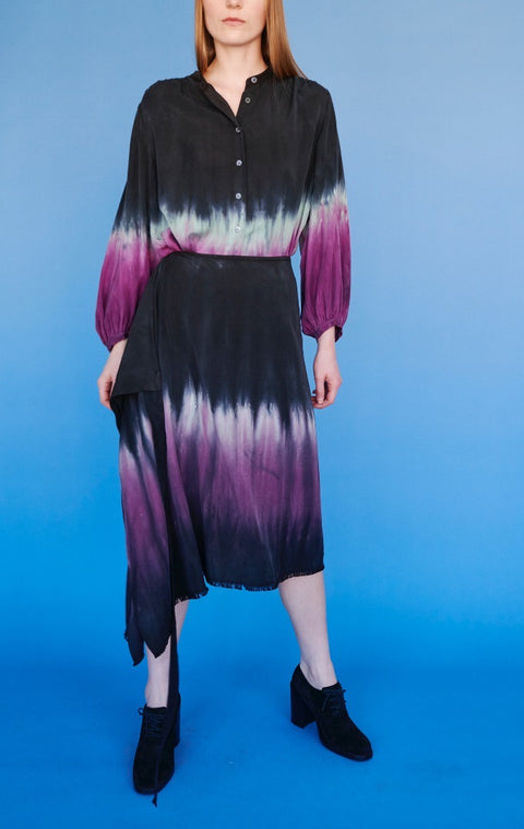 Raquel played with the idea of rebirth as well as growth, revisiting our archive to bring the past into the future. You’ll see favorite fabrics from previous seasons, patch-worked into our over-dyed poet’s blouse and dress. Dip-dyed and sueded silks in gentle colors. Soft suiting. Enjoy!